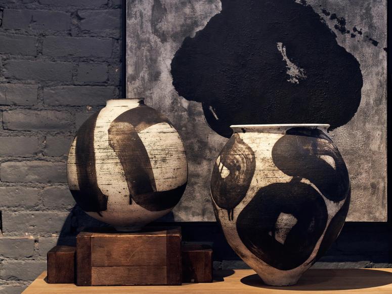 From his Tokyo studio, Japanese artist Kansai Noguchi crafts striking, one-of-a-kind ceramic vases, vessels, and painted canvases that make a bold first impression that invite the eye to linger on their mesmerizing visual contrasts. His preference for working in a limited palette is obvious, and is inspired by ceramics of Japan’s Jōmon period (10,500–300 B.C.), considered among the oldest pottery in the world. Noguchi’s approach isn’t just about visual aesthetics; equally present in his pieces is their ability to possess “sounds of music.”