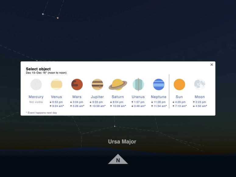 Timeanddate.com, a website run by the Norwegian company Time and Date AS, offers a wealth of information that encourages us to turn our eyes upward. In addition to providing typical location-based tools such as weather forecasts, clocks, and calendars, the site features a Sun and Moon page, which tracks the visibility of the Sun, the Moon, and the planets in the Milky Way from specific locations on Earth. Plug in a city or zip code, and the site’s algorithms—which use data provided by the United States Naval Observatory and NASA—determine when various celestial bodies will rise and set in that particular locale.