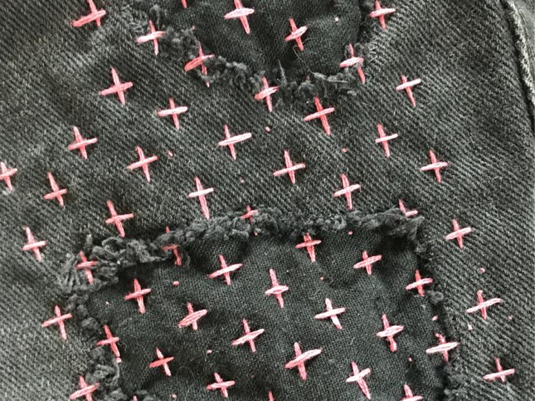 Moore and his team restore ripped seams, tattered knees, and hole-riddled pockets with a range of techniques, such as hand-applying patches, darning stitches, and sashiko (“little stabs”), a decorative type of traditional Japanese embroidery that’s also used to mend fabric. Sometimes their work is undetectable, but usually, it intentionally stands out, celebrating the experiences that led to the garments’ wear and tear. They’ve recently covered a series of snags with a cluster of tiny crosses, and reinforced the pockets on a well-loved pair of Levi’s with concentrated loops of pink and yellow thread. One customer has brought in a favorite Western shirt multiple times, wearing its ever-increasing plots of blue stitches as tiny badges of honor.