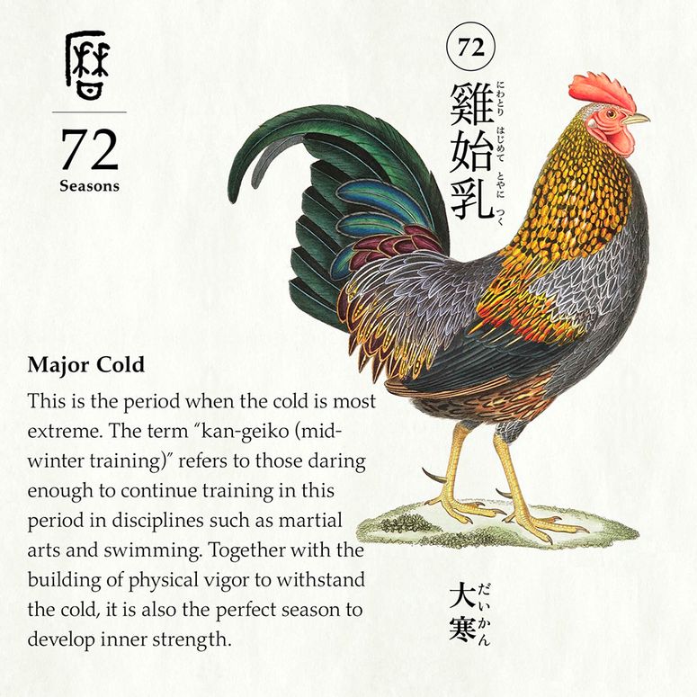 Most would associate February with the dead of winter—long past the joy of the holiday season, yet far enough from April to make us yearn for the warmth of spring. There are only four seasons to anticipate each year, at least in the Western world, but the ancient Japanese lunar calendar, which follows the waxing and waning of the moon, counts many more: 72, to be exact, as we’ve pleasantly discovered in the recently launched app 72 Seasons. Updated every five days, the average length of each micro-season, the app shares more about this cultural tradition, along with haikus, observations on the natural world, seasonal phrases and activities, and the best ingredients to eat and cook at a given time of year. We’re currently in the micro-season of “Major Cold”—though we didn’t need it to tell us that, brrr!—which is set to continue for the next few days. This is the peak season for red seabream, celery, burdock root, as well as when, with spring on the way, “the chicken begins to lay her eggs.”